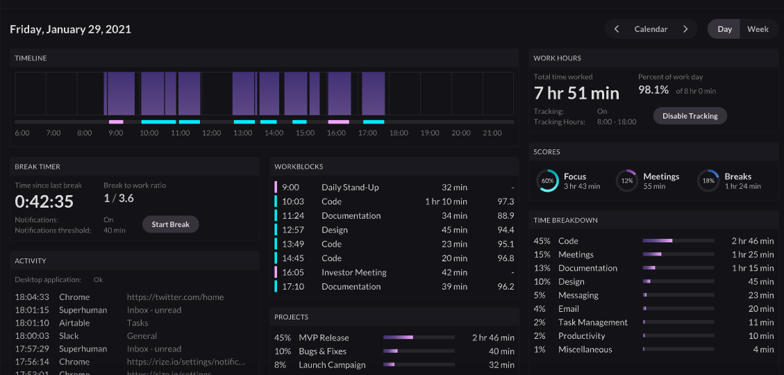 • Total Focus and Break Time: Review total focus time and break time for today